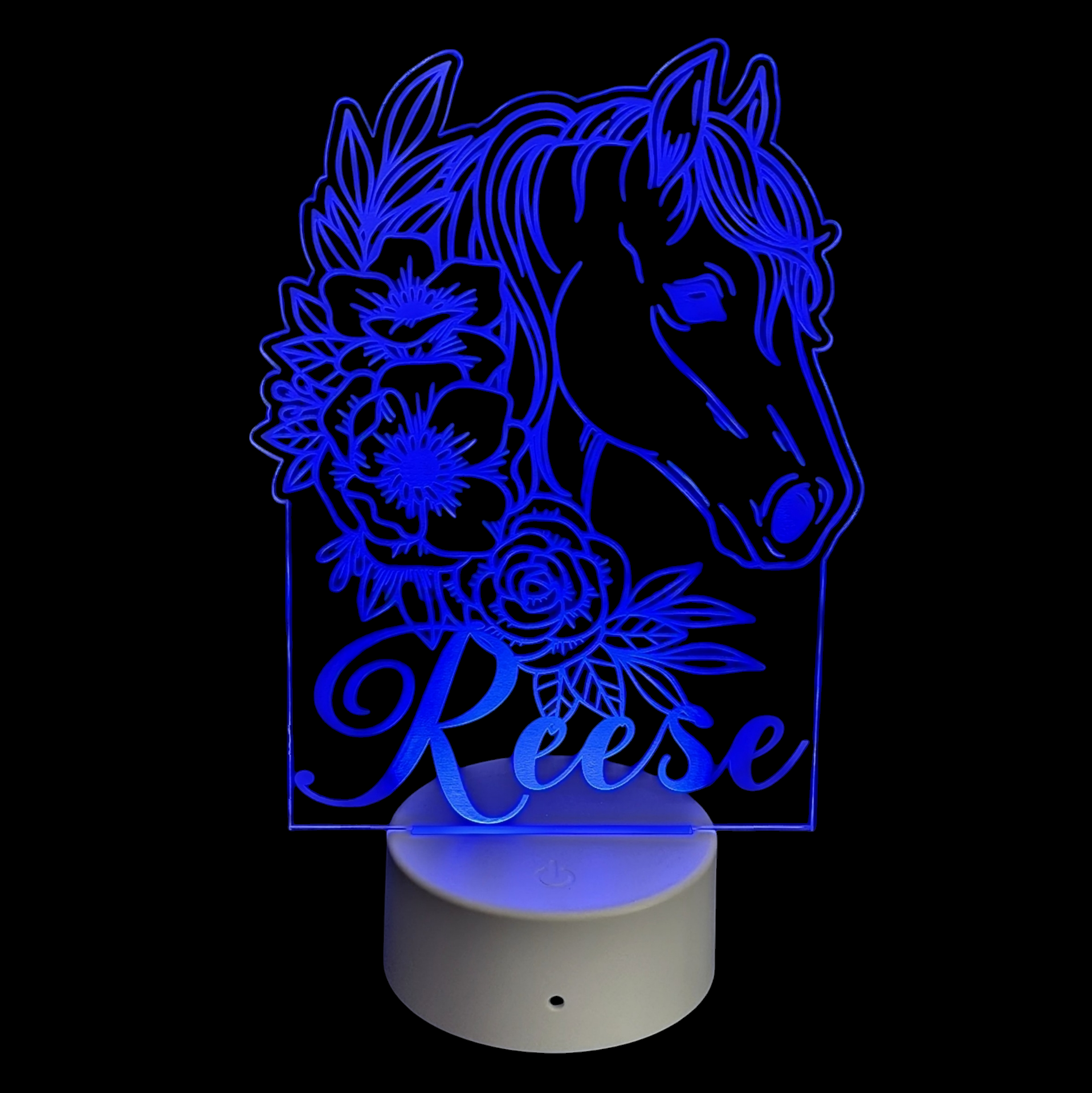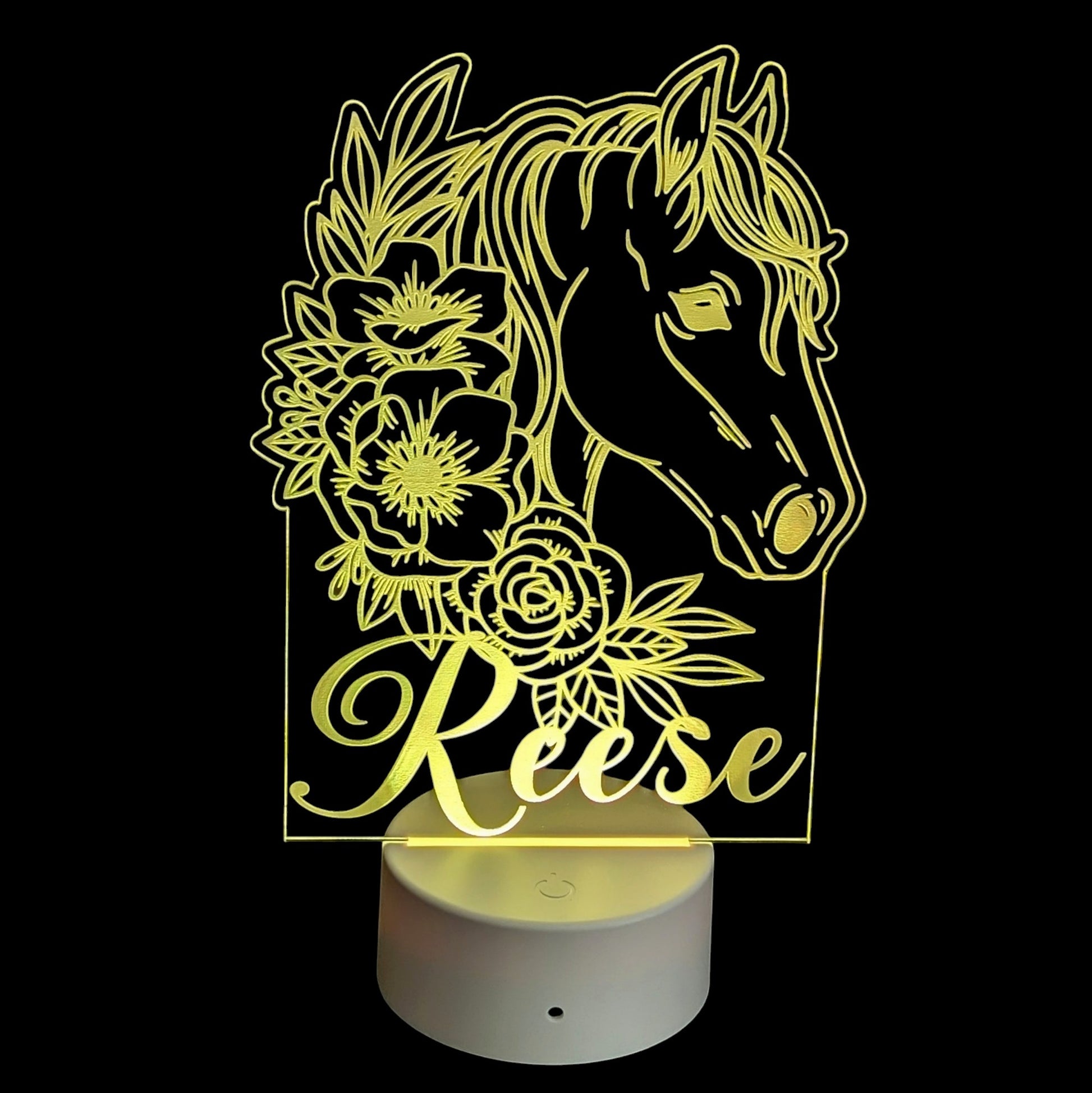 Illuminate any room and sleep peacefully with our elegant Floral Horse design LED Nightlight! This item can be personalized with a name or text of your choice. The LED base can be powered by 3 AA batteries or the included USB cord. The LED base has multiple color options. The colors can be changed by touching the power button on the base or via the included remote control.